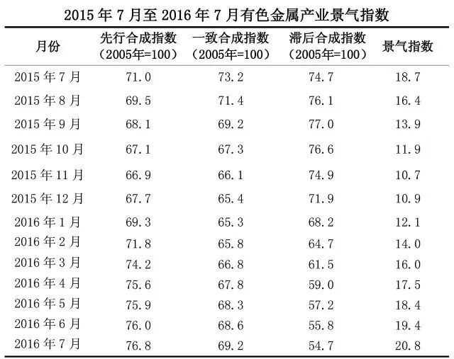 2016年7月,中经有色金属产业景气指数显示为20.8,较上月回升1.4点。景气指数连续8个月小幅回升,但回升幅度有限,行业运行底部已经形成,但未来发展仍有许多不确定因素。