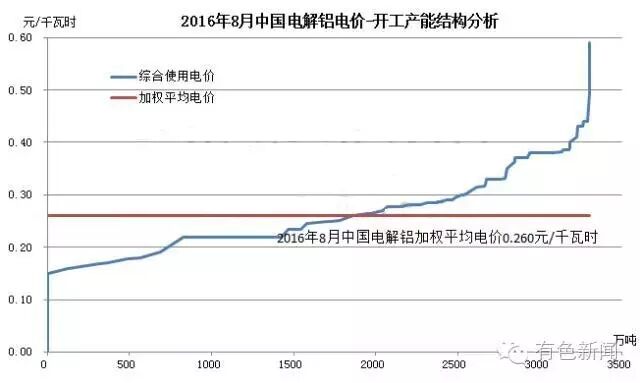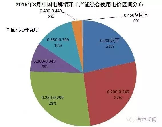 百川资讯统计,2016年9月中国电解铝按照开工产能加权平均电价为0.2638元/千瓦时,较8月份上涨0.0036元/千瓦时。其中,全国电解铝企业最低综合使用电价0.165元/千瓦时,最高综合使用电价0.495元/千瓦时。从综合使用电价的区间分布来看,0.20元/千瓦时以下的开工产能占国内电解铝总开工的20%;0.20-0.25元/千瓦时对应的开工产能为1006.5万吨,占总开工的30%;0.25-0.30元/千瓦时对应的开工产能为890.8万吨,占总开工的26%。0.30元/千瓦时以上对应的开产能共计占内电解铝总开工的24%。