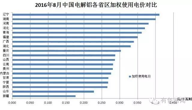 分地区来看,2016年9月中国电解铝照开工产能加权平均电价最低的省份是新疆(0.182元/千瓦时),之后依次是山东(0.223元/千瓦时)、甘肃(0.264元/千瓦时)、宁夏(0.266元/千瓦时)、内蒙古(0.280元/千瓦时)……辽宁(0.410元/千瓦时)仍为全国最高。