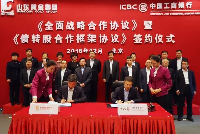 12月9日,山东黄金集团与中国工商银行《全面战略合作协议》暨《债转股合作框架协议》在工行总部签署。作为工商银行首单市场化债转股项目,集团将与工商银行开展总规模约100亿的债转股业务,并获得200亿的战略合作融资额度,用于降低集团杠杆率,助力集团优化财务结构、提升市场形象、增强发展动力。