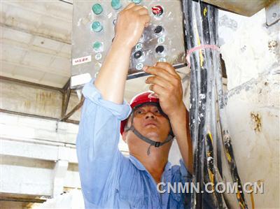 中铝山东企业严格执行夏季“四防”和安全巡检维护制度,新材料公司拟薄水铝石产品区检修员工在专注地排查电器隐患。王艾梅 刘雷 摄