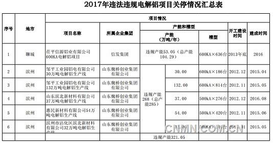 《山东省2017年煤炭消费减量替代工作行动方案》中提到,山东省应抓紧完成电解铝违法违规项目清理。根据企业自查和山东省核查情况,山东魏桥创业集团和信发集团2家企业存在违规电解铝产能321万吨,并配套建设违规煤电机组,耗煤量巨大。其中:魏桥创业集团违规建成电解铝项目5个,违规产能268万吨;信发集团违规产能53万吨。对以上违规电解铝项目,由滨州、聊城市人民政府负责于7月底前关停,同时分别停运相应规模煤电机组(不含已纳入2017年及以前年度淘汰关停机组)。其中,滨州市魏桥集团停运煤电机组570万千瓦左右;聊城市信发集团停运煤电机组100万千瓦左右。根据以上违规电解铝产能及配套煤电机组关停时间,对比去年和今年生产情况,具体核算压减煤炭消费量实际效果,争取压减煤炭消费量1000万吨。