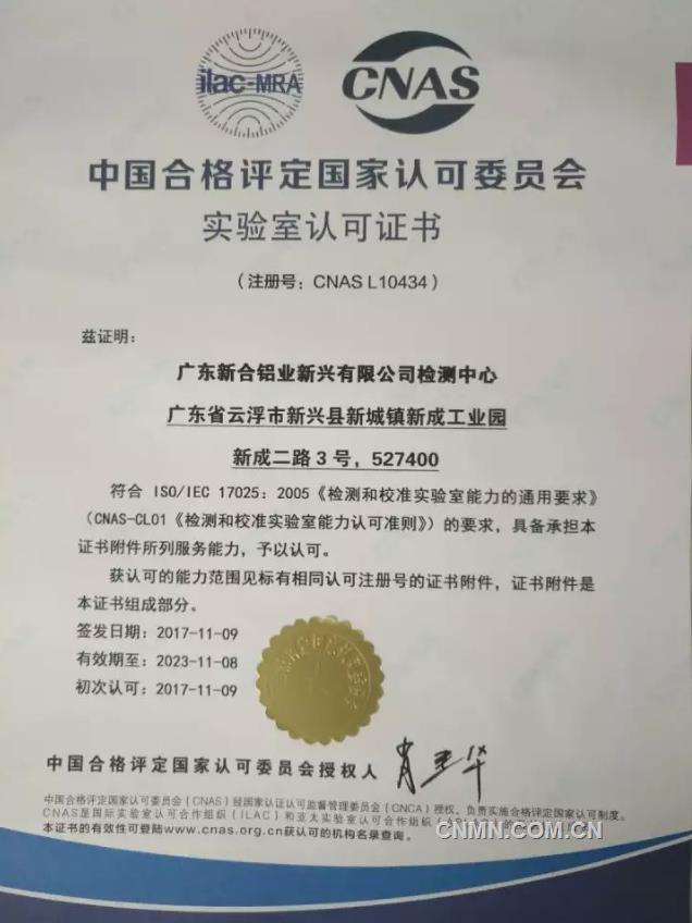 近日,新合铝业检测中心经中国合格评定国家认可委员会评定,正式获批成为国家级实验室。新河铝材产品检验水平及新产品研发水平得到了最专业评定机构的认可,为新河供应最优质的铝型材产品保驾护航。