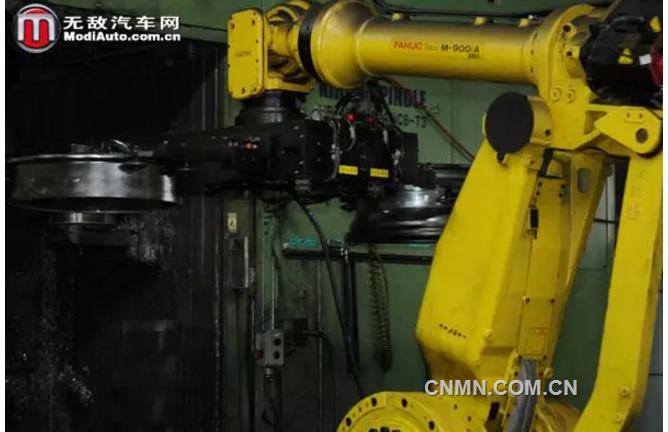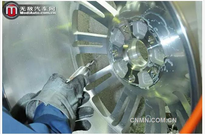 退火之后,轮圈将被运送到高度自动化的机械加工中心。基本上是以机械人进行操作,机械加工中心负责完成锻造工艺无法实现的步骤,例如把轮辐之间的多余的铝材切除,以及精加工出螺丝孔、中心孔以及轮圈法兰位置的偷空部位等。机械加工之后,专门的技工对刀具切割而产生的毛边进行打磨,之后轮圈就算基本成型了。